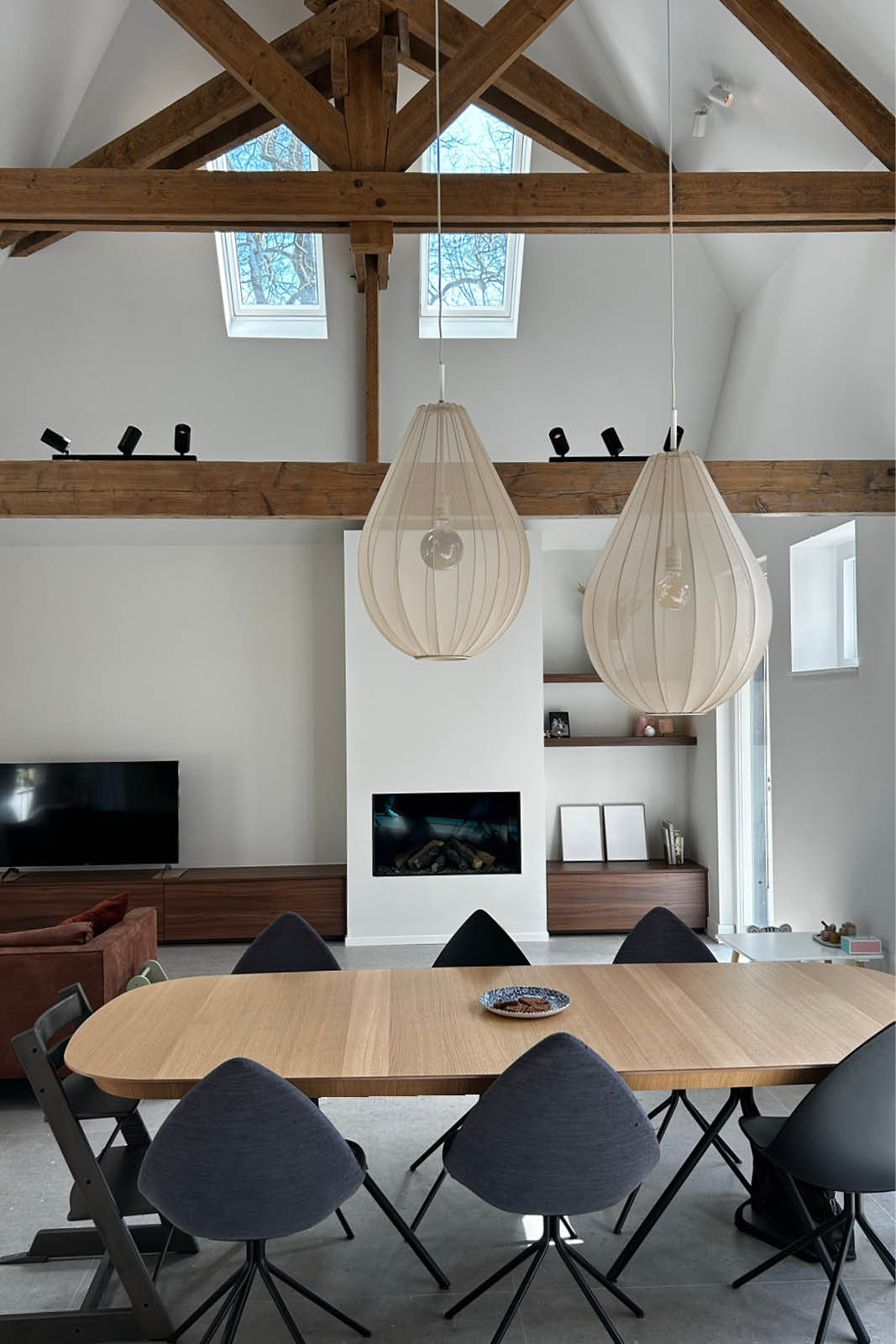 Een van de belangrijkste ingrepen was het verwijderen van een verlaagd plafond. Hierdoor werd de originele kapconstructie weer zichtbaar: robuuste houten spanten geven de ruimte karakter en grandeur. In de kap hebben we dakramen toegevoegd voor extra daglicht. Aan de tuinzijde zorgt een nieuwe pui met openslaande deuren voor een open verbinding tussen binnen en buiten. Extra aandacht heeft de detaillering van de bestaande staldeuren gekregen. Uitgangspunt was dat we met het plaatsen van HR++ glas zo min mogelijk toevoegingen zouden doen, zodat het lijkt alsof de deuren openstaan. Het was zoeken naar het evenwicht tussen esthetiek, bouwfysica en bouwkosten. Het contact met de gemeente tijdens de vergunningsaanvraag was hierbij prettig.